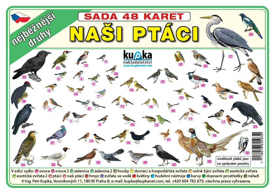 Sada ilustrací našich nejběžnějších ptáků (48 karet).